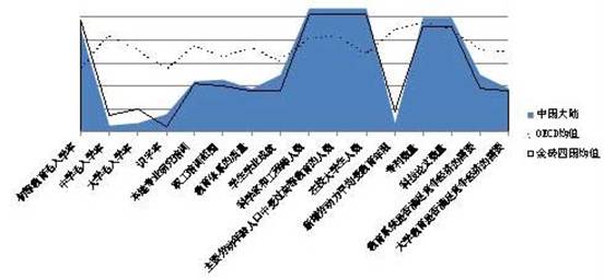 从百万居民的相对指标看,中国1999年的4项指标都低于经合组织国家均值和金砖四国均值。其余各项指标除了初等教育毛入学率略高于经合组织国家均值和金砖四国均值外,均低于经合组织国家均值和金砖四国均值。然而,到2006年,中国在识字率、本地专业研究培训、职工培训范围、教育体系的质量、学生学业成就等指标上均高于金砖四国均值。在大部分指标上与经合组织等发达国家的差距明显缩小。