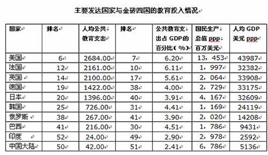 中国的人均公共教育支出为42美元,美国为2684美元,是中国的63.9倍。如果考虑到人口的因素,我们以人均GDP来比较,中国人均公共教育支出仅为人均GDP收入的0.82%,美国为6.10%,是中国的7.44倍。日本为4.28%,韩国为3.01%。俄罗斯为1.87%,是中国的2.28倍,巴西为2.29%,是中国的2.79倍。所以中国不仅与发达国家有很大差距,即使在金砖四国中,中国的教育投入也排在末位。