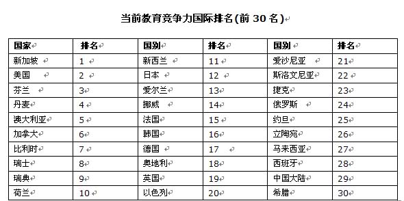 在所选的53个国家中,教育竞争力排在前5位的分别为新加坡、美国、芬兰、丹麦、澳大利亚(见下表)。排在最后5位的国家分别是印度、墨西哥、土耳其、秘鲁、委内瑞拉,以发展中国家为主。中国教育竞争力居于第29位,属于中等水平。